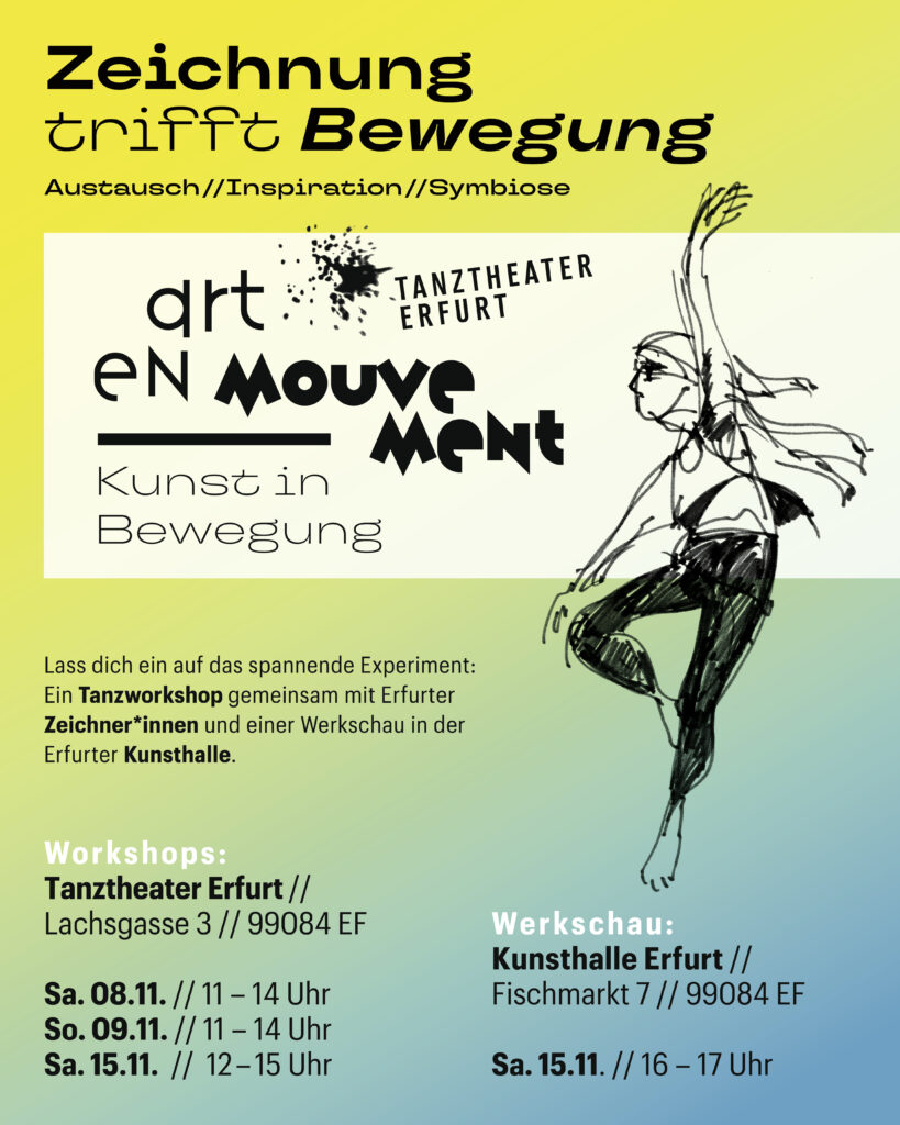 Das Tanztheater Erfurt lädt die Zeichenrunde ein, partizipativer Teil des Projekts „Art en Mouvement“ zu werden. Hier soll Spontaneität, Unplanbares und Unmittelbares im Fokus stehen. Verstanden als Plattform für Künstler:innen und Kreative aus verschiedensten Bereichen der darstellenden und bildenden Kunst, können wir miteinander und interdisziplinär im offenen Prozessen improvisieren und neue Ausdrucksformen entdecken und präsentieren.