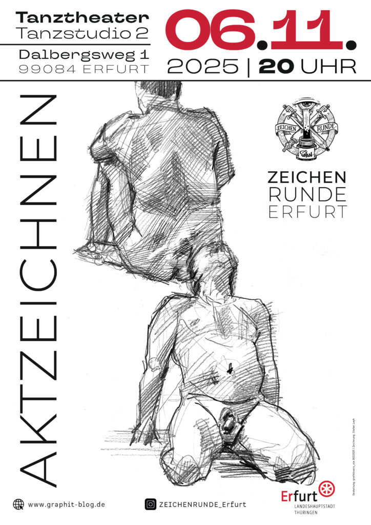 Mit Unterstützung der Stadt Erfurt/Kulturdirektion können wir das AKTZEICHNEN-Format kostenfrei in regelmäßigen Abständen anbieten. Den für die Förderung geforderten Eigenanteil durch Spenden zu erbringen, bleibt dabei weiterhin notwendig, unsere Spendenmaus freut sich deshalb wieder auf input;–)