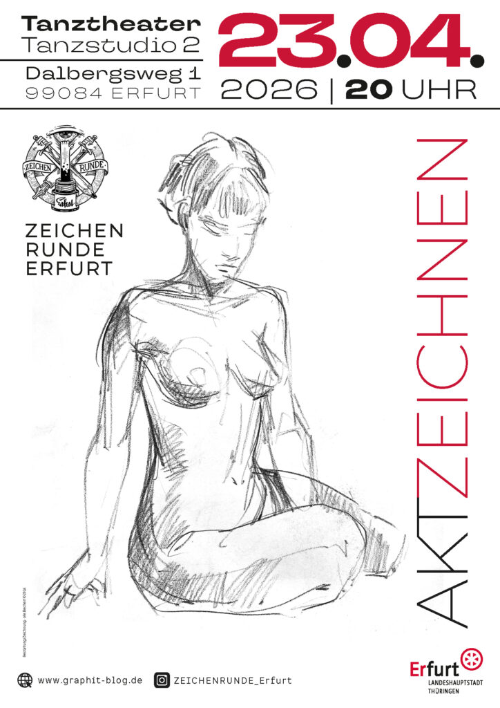 Die gute Nachricht zuerst: Da wir die aktuelle Info aus der Kulturdirektion bekommen haben, das die Zeichenrunde Erfurt auch in diesem Jahr wieder, wie beantragt, Förder-Unterstützung durch die Stadt Erfurt erhält, können wir bereits die ersten AKTZEICHNEN-Termine planen! Yeahhh…