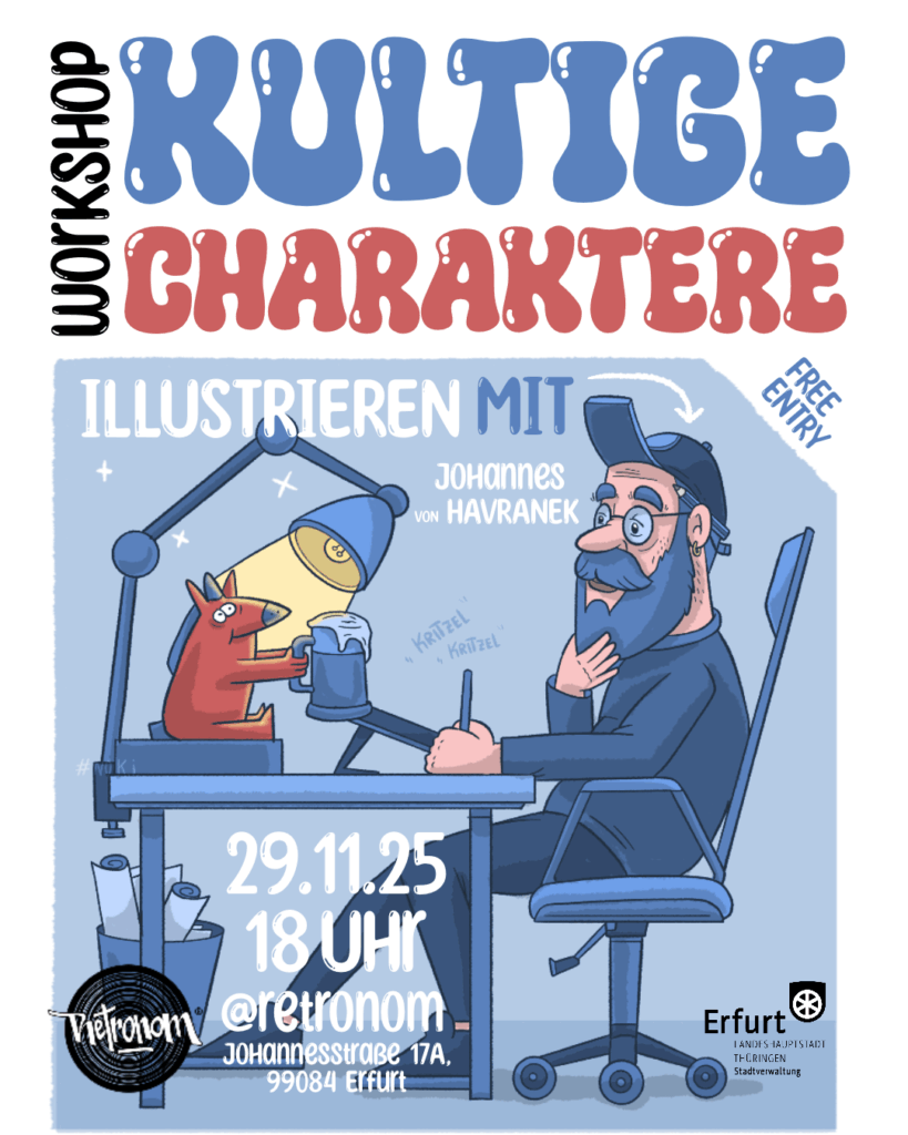 Am Samstag, dem 29.11.2025, könnt ihr mit Johannes von Havranek in die farbenfrohen Welten der Comic-Charakter-Illustration eintauchen. Lasst euch von skurrilen Früchten, kultigen Tieren oder schrägen Typen inspirieren und entwickelt eure eigenen Kultigen Charakter mit der Magie des Zeichnens.