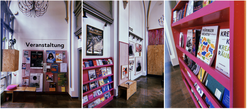 Neben Information, Beratung und Netzwerken bietet der Laden außerdem in Erfurt lebenden Künstler:innen die Möglichkeit, ihre Werke zu zeigen – zeitweise und absolut unproblematisch. Die Holzwand, an der also auch eure Zeichnungen hängen könnten, ist durch die raumhohen Fenster selbst von der Straße aus einsehbar und wird auch außerhalb der Öffnungszeiten des Ladens ausgeleuchtet.